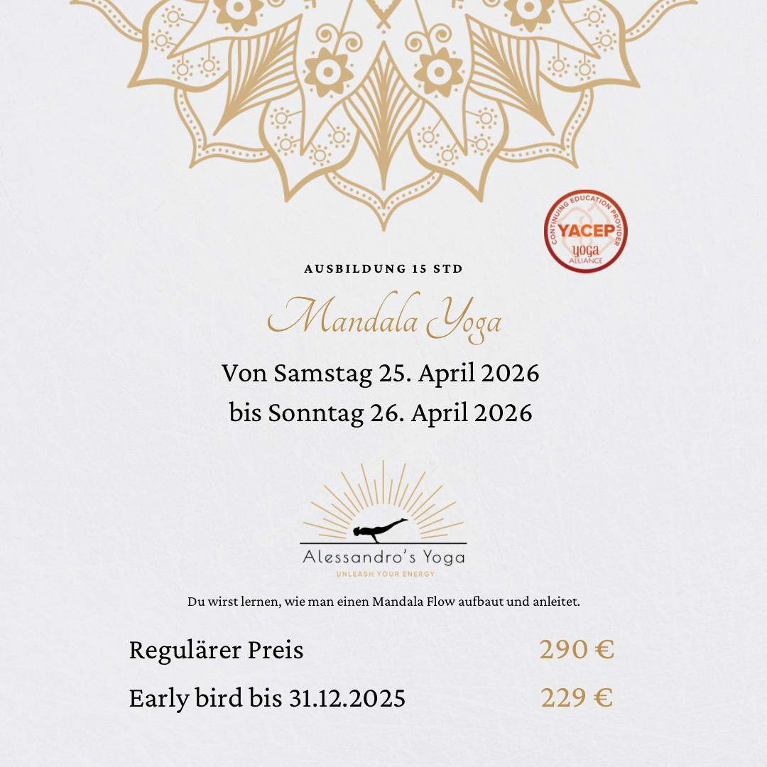 Wenn du bereit bist, deine Praxis zu erweitern und in die Welt des Mandala Yoga einzutauchen, laden wir dich ein, an einem exklusiven Ausbildungskurs teilzunehmen, der von Alessandro an der Yoga Schule “Alessandro’s Yoga” angeboten wird.